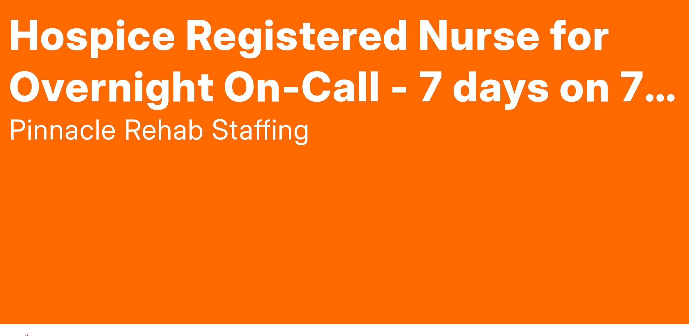 We are looking for a Full-Time Registered Nurse (RN) for a high-paying overnight On-Call Home Hospice position. This schedule is one week on, one week off. The RN will be on-call from 4:30 PM to 8:30 AM for 7 consecutive days, followed by 7 days off.