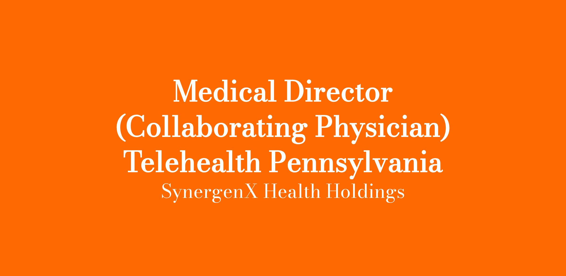 SynergenX / Low T Center is seeking a Board-Certified Family Medicine or Internal Medicine Physician in Pennsylvania to serve as a supervising/medical director for our innovative telemedicine hormone replacement and weight-loss program.